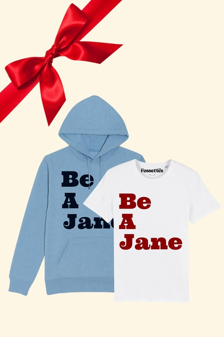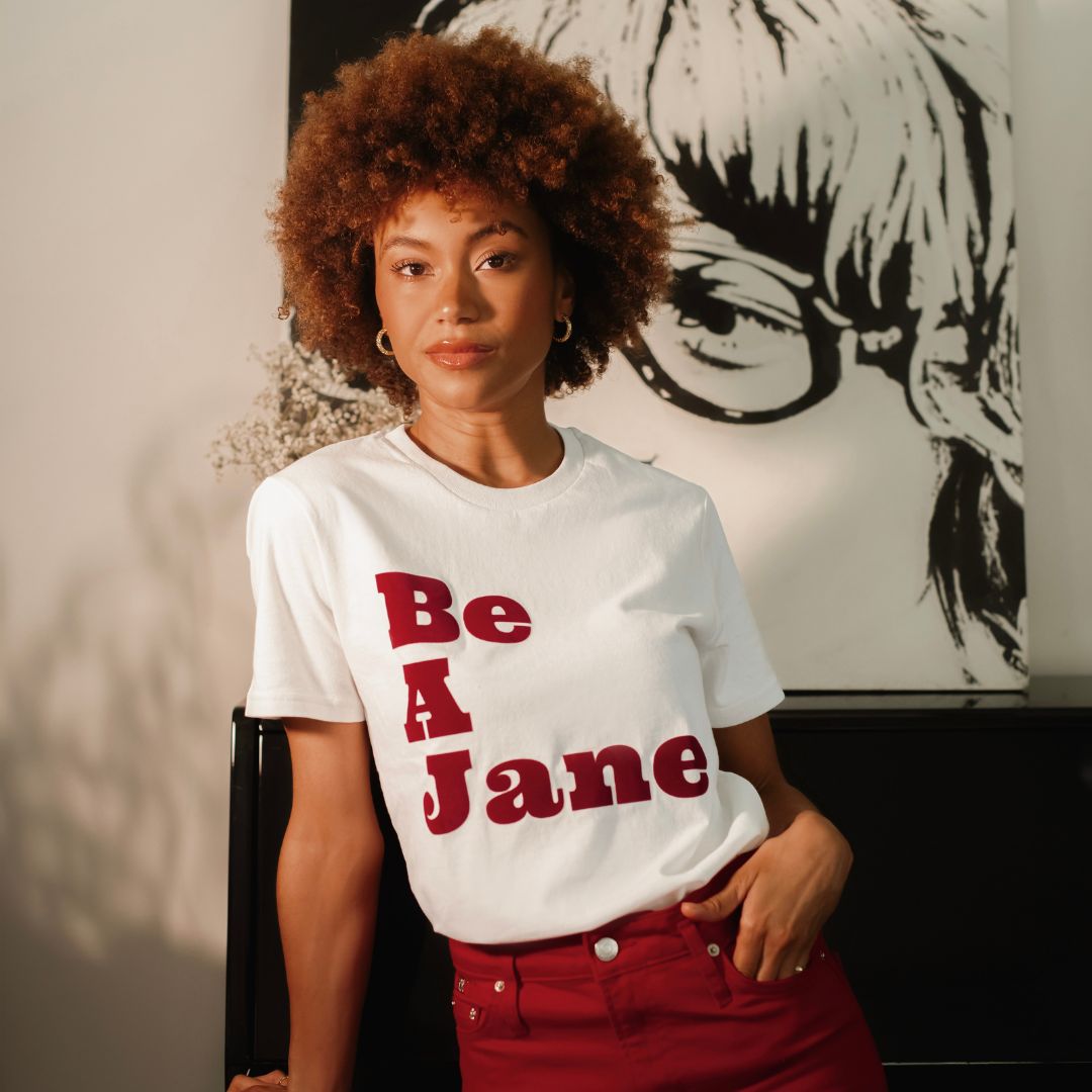 Et pour compléter l’ensemble : un t-shirt blanc chiné marqué d’un velours rouge « Be A Jane », pour ne jamais oublier la Jane qui sommeille en vous.