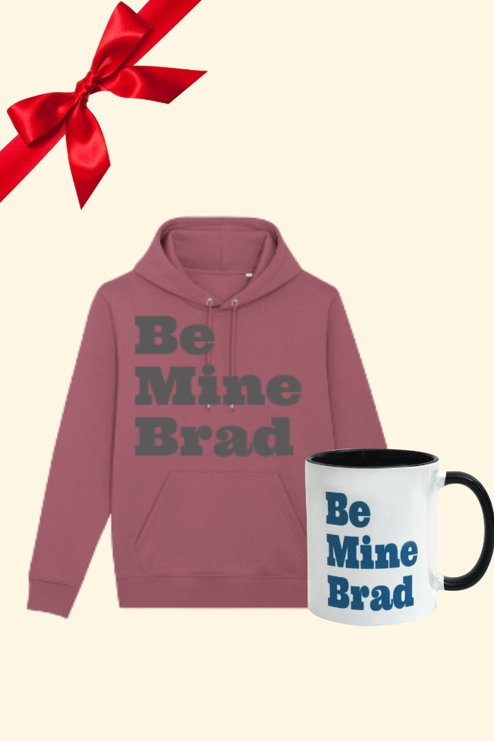 À ses côtés, une tasse assortie « Be Mine Brad », idéale pour savourer votre boisson préférée avec classe, humour et un brin d’audace.