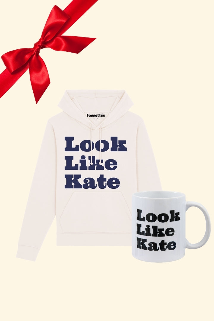 À ses côtés, une tasse blanche au logo bleu « Look Like Kate », idéale pour savourer votre boisson préférée avec cette touche de classe et de simplicité qui fait toute la différence.