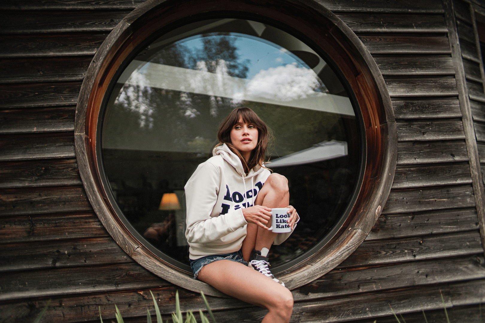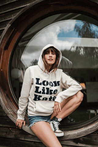 Un sweat-shirt blanc mastic à capuche, floqué d’un velours bleu marine « Look Like Kate », une pièce douce, vintage et chic, parfaite en ville, après un cours de pilates ou lors d’un moment cosy à la maison.