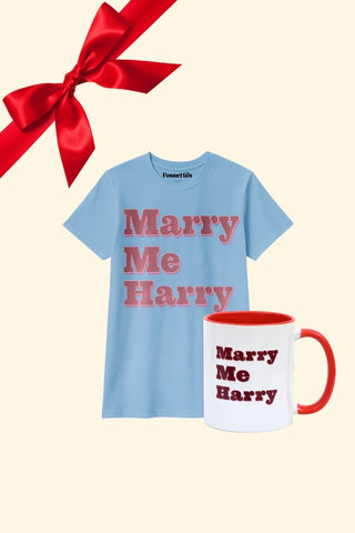 Un t-shirt bleu en coton biologique, imprimé d’un rose lumineux « Marry Me Harry », pour envoyer un message aussi tendre que direct.