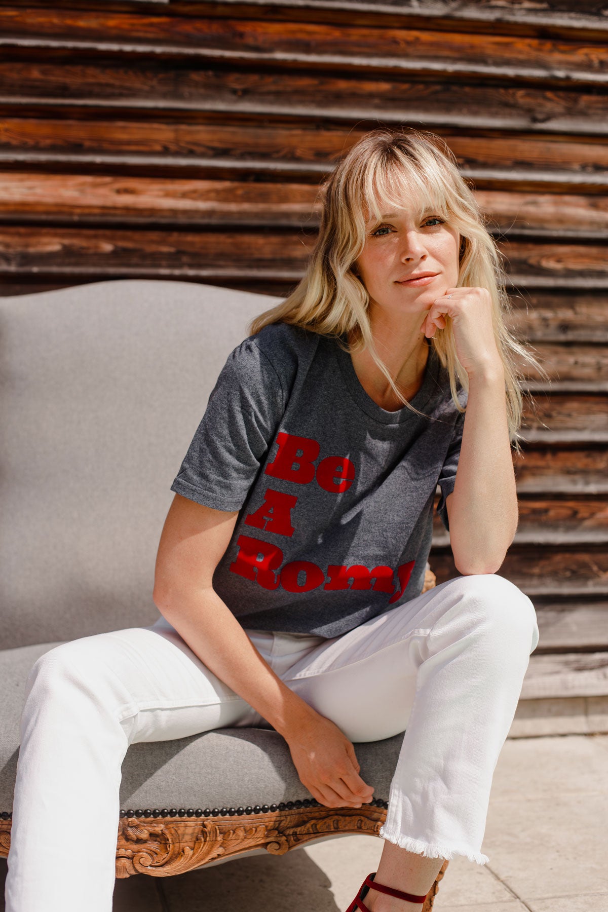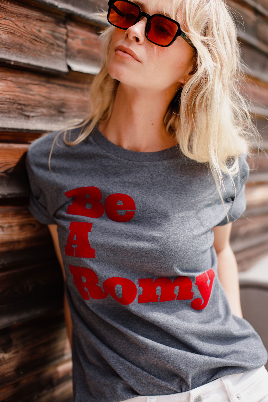 Un t-shirt gris en coton biologique, orné d’un marquage velours rouge “Be A Romy”, qui mêle douceur, style et inspiration au quotidien.