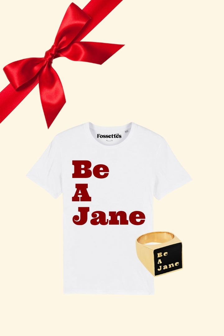 Un t-shirt blanc chiné au marquage velours rouge « Be A Jane », une pièce iconique pour ne jamais oublier la Jane qui vit en vous : libre, audacieuse, inspirante.