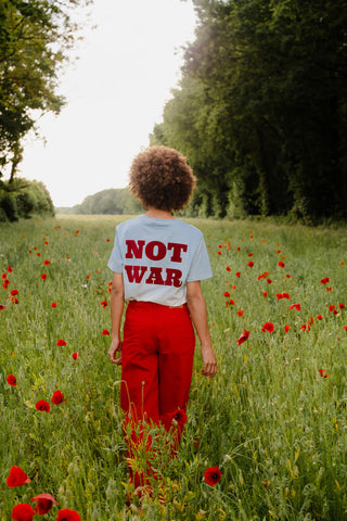 Un t-shirt tie & dye bleu en coton biologique, floqué d’un velours rouge « Make Love » sur le devant et « Not War » dans le dos. Une pièce vibrante et engagée, parfaite pour rappeler que c’est toujours l’amour qui doit gagner.